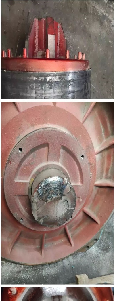 某修理公司承接了一臺YE3-355-6 380V 50Hz 220kW電機,該電機實際配套破碎設備,軸采用幅板結構,斷裂口在軸伸端幅板端部位置,因為軸斷裂,電機已嚴重掃膛;該電機采用皮帶輪傳動,使用20天左右。以下是現場拍到的斷口圖片: